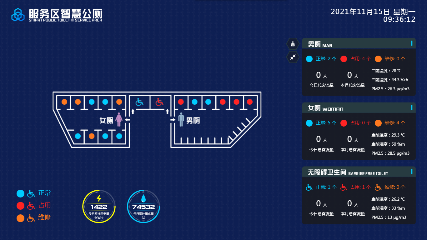 智慧服務區廁所管理平臺可以收集數據(包括廁所使用、環境氣味監測等),自動生成日報、周報、月報、季報、年報等常規報告,支持數據分析、支持報告導出和打印功能,滿足管理需要。