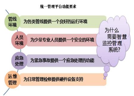 城市綜合管廊內部不僅整合了維持城市功能的自來水、煤氣、電力、通信管線,而且管廊自身功能使用的動力、照明、排水等設備繁多,無論納入管線出現故障,還是自身附屬設備出現故障,都將造成沿線城市功能的癱瘓,因此建設城市綜合管廊智慧監控管理系統意義重大。