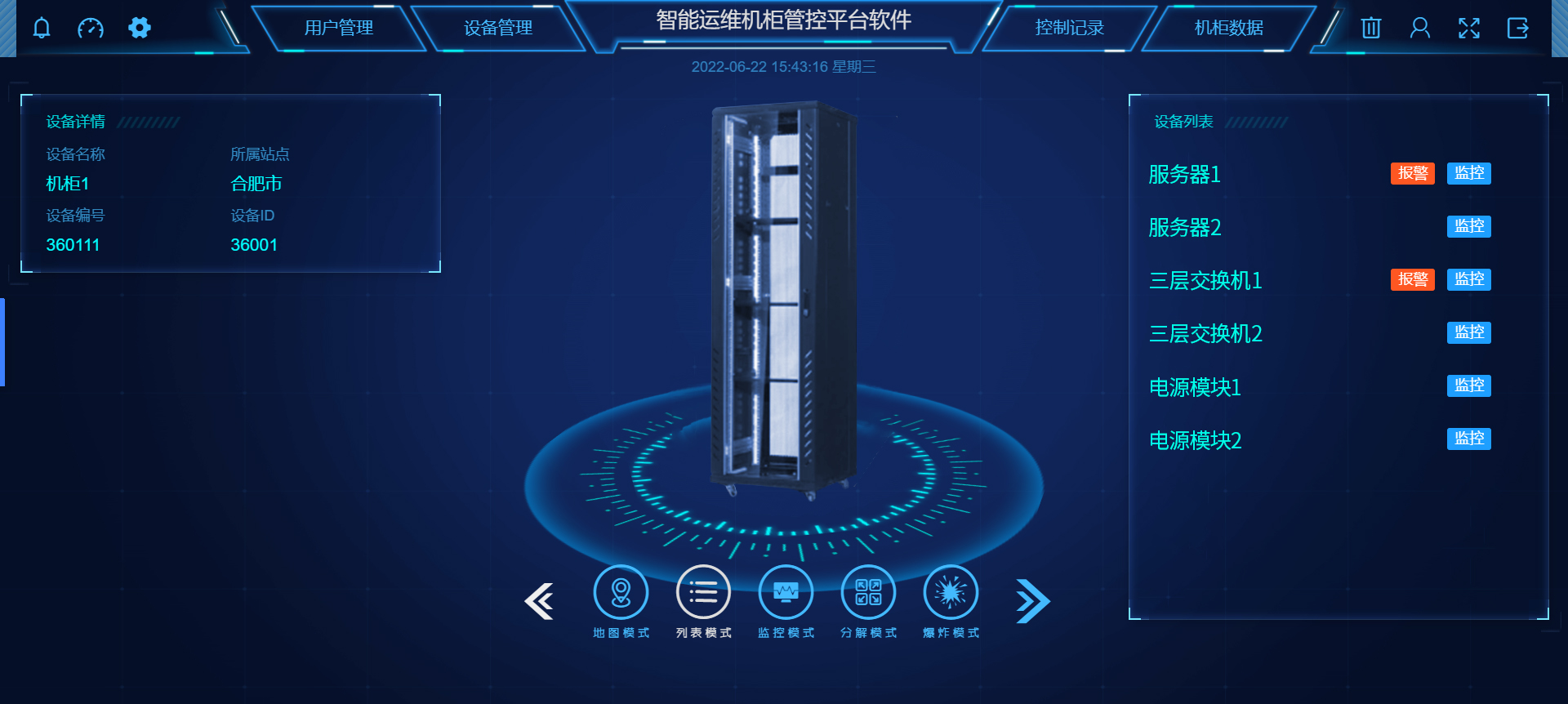 智能機柜運維管理平臺,實現對機房機柜的運維管理,方便管理人員以更直觀的查看當前機柜內設備的運行狀態,可以在監控報警后輔助管理員第一時間知道機器或者設備的物理位置、方便處理故障。